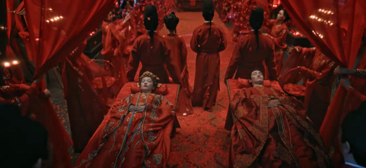 没有血腥的镜头,没有鬼脸特效,而是靠“宫墙血牡丹”“喜轿变骷髅”“古画美人现身”这些充满东方意象的场景营造氛围。