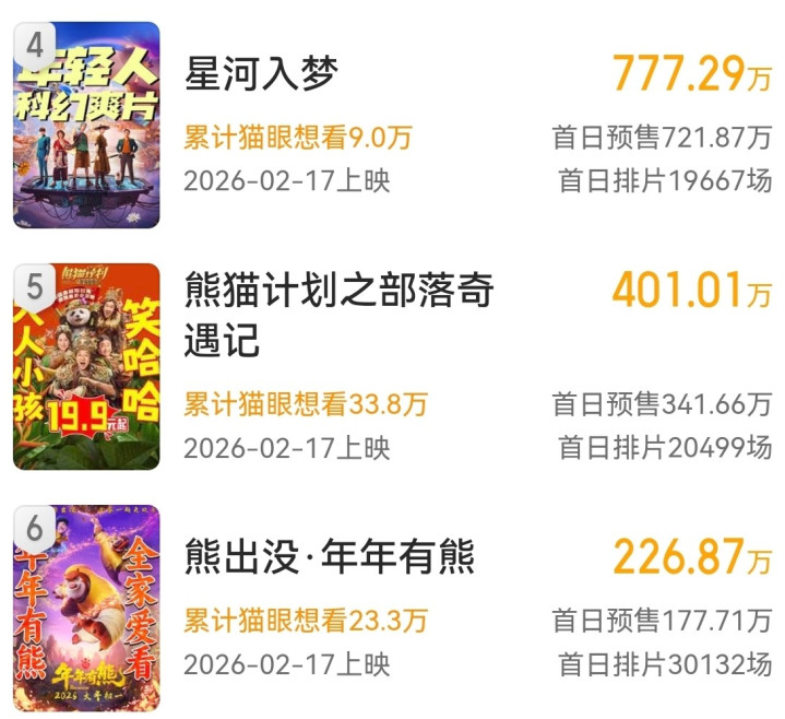 首日排片不足2万场,但预售成绩并不是最差的,可见市场完全低估了观众对《星河入梦》的期待值。